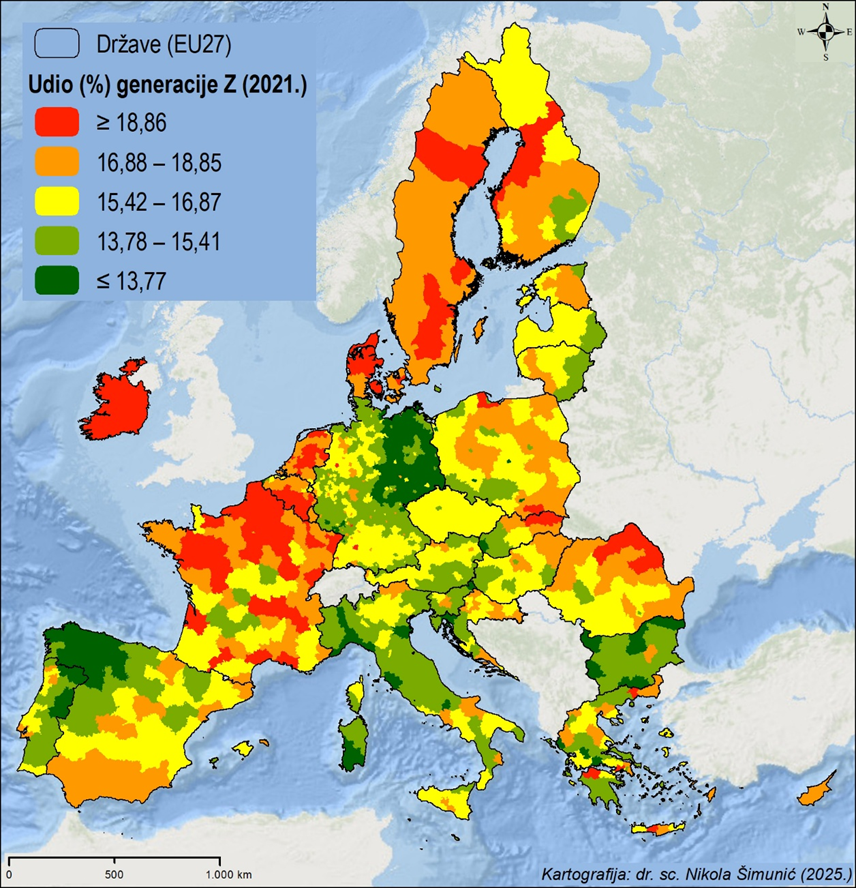 Slika 2. Prostorna distribucija udjela (%) pripadnika generacije Z u ukupnom stanovništvu europskih NUTS 3 regija (2021.)