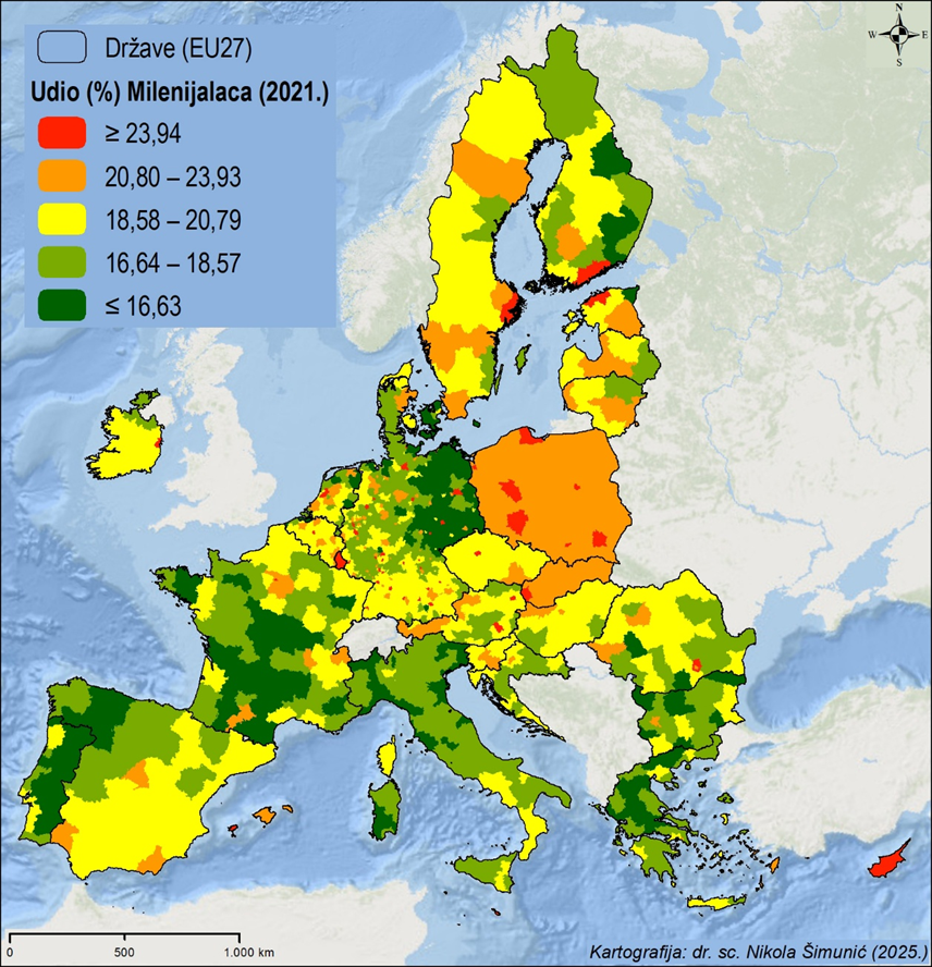 Slika 3. Prostorna distribucija udjela (%) pripadnika generacije Milenijalaca (Y) u ukupnom stanovništvu europskih NUTS 3 regija (2021.)