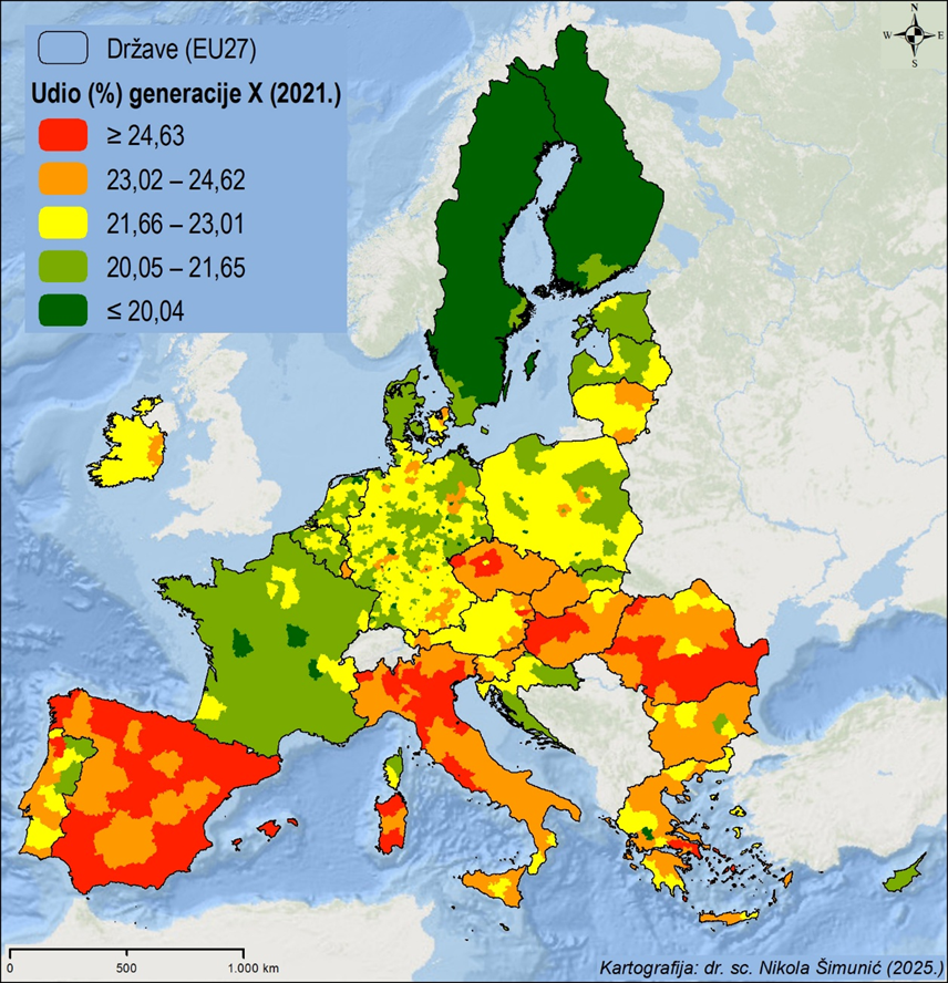 Slika 4. Prostorna distribucija udjela (%) pripadnika generacije X u ukupnom stanovništvu europskih NUTS 3 regija (2021.)