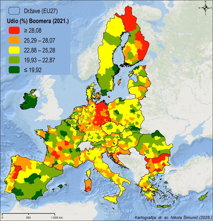 Slika 5. Prostorna distribucija udjela (%) pripadnika generacije Boomera u ukupnom stanovništvu europskih NUTS 3 regija (2021.)