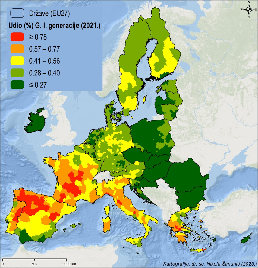 Slika 7. Prostorna distribucija udjela (%) pripadnika G. I. generacije u ukupnom stanovništvu europskih NUTS 3 regija (2021.)