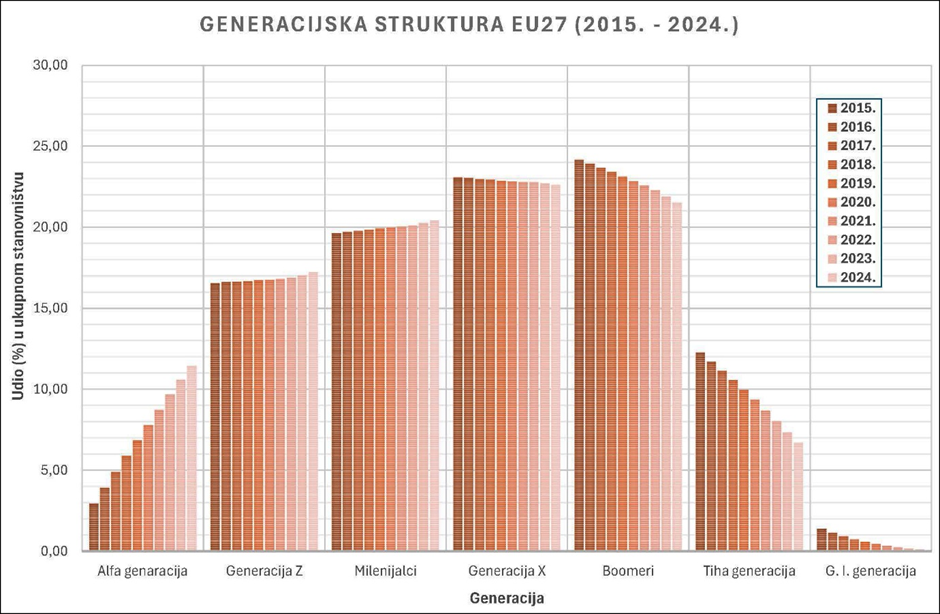 Uvid u Eurostatove podatke za sve države članice posljednjeg desetljeća otkriva proces smjene generacija čiji učinci nadilaze puki statistički prikaz. 2015. godine starije generacije (Boomeri, Tiha i G .I.) činile su gotovo polovicu ukupnoga stanovništva EU. Međutim, zbog kombinacije intenzivnoga starenja, niskih stopa fertiliteta i pojačanih migracija, taj udio se znatno smanjuje do 2024.  Boomeri i dalje čvrsto drže oko 21,5% populacije, no Tiha generacija pada s 12,3% na 6,7%, a G. I. ostaje na samoj margini s 0,11%.​ Suprotno tome, najmlađe generacije (Alfa i Z) bilježe stalan rast: u 2024. Alfa generacija doseže gotovo 12,0%, a generacija Z prelazi 17,0%. Boomeri su sve do 2020-ih najveća aktivna kohorta (preko petine populacije), ali postupno ustupaju mjesto, u tom statusu, milenijalcima (generaciji Y) koji su trenutno „sidro“ aktualne radne i obiteljske dinamike (Slika 8.). Ovakva preraspodjela (Tablica 1.) rezultira drugačijom strukturom potreba jer se zdravstveni, mirovinski i obrazovni sustavi u državama članicama susreću s nesigurnostima održivosti, dok se socijalna politika nastoji prilagoditi izazovima više generacijskih skupina.​