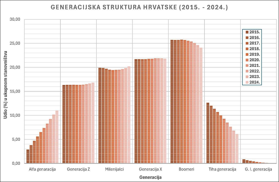 Hrvatska, u okviru Europske unije, ima posebno zanimljiv generacijski profil (Slika 9.) koji značajno odstupa od prosjeka Europske unije, te snažno reflektira povijesne, migracijske i socioekonomske specifičnosti zemlje. U Hrvatskoj (2024.) i dalje dominiraju četiri glavne generacije: X, Boomeri, Milenijalci i sve manja, ali još uvijek demografski prisutna, Tiha generacija. Udio Boomera i Tihe generacije zajedno iznosi preko četvrtine ukupnoga stanovništva Hrvatske, što je nešto više od prosjeke EU, ali kud i kamo više od nekih „mlađih“ članica EU, npr. Irske, Mađarske, Slovačke, Poljske i Rumunjske. Takva starija dobna struktura rezultat je dugotrajnog procesa smanjene stope fertiliteta, nedavne intenzivne emigracije mladih (posebice Milenijalaca i Z generacije) i produženog životnog vijeka, što je osobito vidljivo u ruralnim i demografski opustošenim dijelovima Hrvatske.​ Posljedično tome, Milenijalci i Z generacija u Hrvatskoj danas imaju nešto manji udio nego što je slučaj u većini zapadnoeuropskih zemalja.
