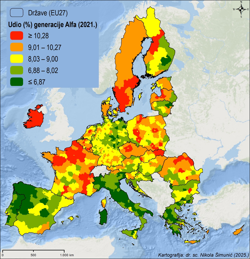 Slika 1. Prostorna distribucija udjela (%) pripadnika generacije Alfa u ukupnom stanovništvu europskih NUTS 3 regija (2021.)[2]