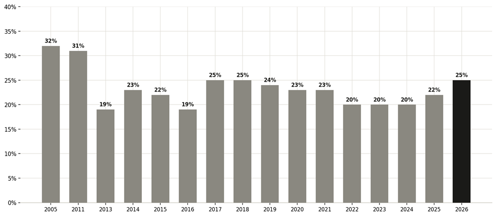 Grafikon 2. Udio kupaca knjiga, 2005.–2026.