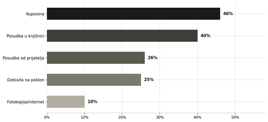Što se tiče nabave knjiga, dominiraju dva kanala: kupovina (46 %) i posudba u knjižnici (40 %). Posudba od prijatelja treća je po redu s 26 %, ali bilježi višegodišnji pad. Navike se znatno razlikuju prema demografskim skupinama: mladi do 25 godina najčešće posuđuju u knjižnici (63%), dok su mladi u dobi 26–35 godina najskloniji kupovini (65 %). Posudbu od prijatelja najčešće biraju sredovječni čitatelji (46–55 godina) i oni s nižim primanjima.