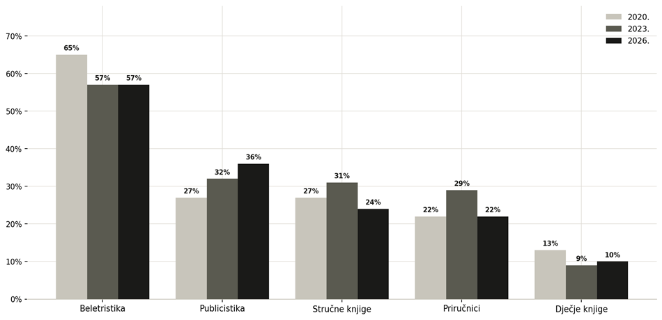 Grafikon 4. % čitatelja prema vrsti knjige – usporedba 2020., 2023. i 2026.