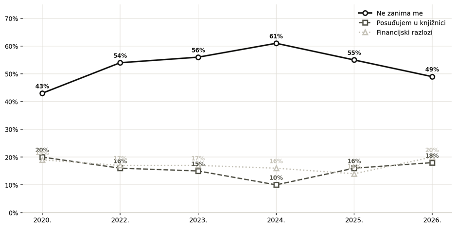 Drugi po učestalosti razlog je posudba u knjižnici (18 %) – osobito kod najmlađih (31 %) i visokoobrazovanih (26 %), što sugerira da interes za knjige postoji. Financijski razlozi vratili su se na razinu od 20 % (porast s 14 % u 2025.). Vjerojatno je riječ o odrazu inflatornih pritisaka na kućne budžete.