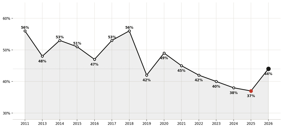 Grafikon 1. Udio čitatelja u Hrvatskoj, 2011.–2026.